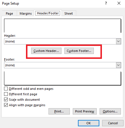 Trong hộp thoại Page Setup, các bạn chọn tab Header/Footer => Custom Footer để đánh số trang ở dưới mỗi trang. Các bạn cũng có thể chọn Custom Header nếu muốn đánh số trang ở trên mỗi trang.