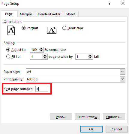Các bạn chọn tab Page, tại ô First page number các bạn đánh số trang đầu tiên. Ví dụ: sheet đầu tiên chứa 3 trang và bạn muốn số trang trong sheet thứ hai bắt đầu bằng 4 vậy thì các bạn đánh số 4.