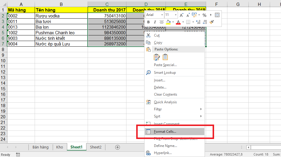 Bước 2: Sau khi bôi đen, ta nhấp chuột phải vào vùng chọn rồi chọn Format Cells (hoặc bấm tổ hợp phím Ctrl + 1):