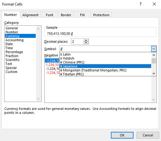 | 12345.5 | Currency | Định dạng số tiền với ký hiệu tiền tệ đằng sau tùy vào cài đặt Region. | 12.345,50 ₫ (tuỳ Region/ký hiệu) |