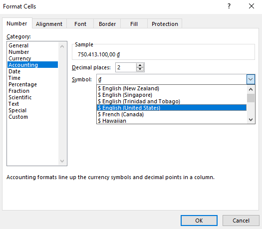 - Accounting để định dạng tiền tệ dạng kế toán.