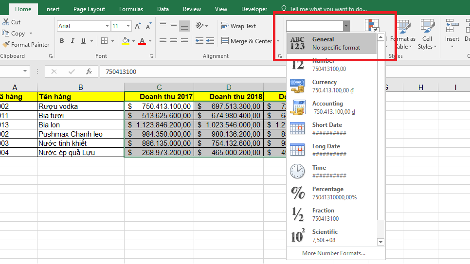 Bước 2: Ta vào thẻ Home > tìm mục Number rồi chọn vào mũi tên thả xuống để hiển thị danh sách các loại định dạng số có sẵn trong Excel.
