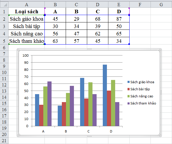 Ví dụ như ta có dữ liệu và tạo biểu đồ như sau: