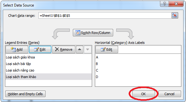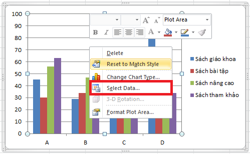 Theo cách này ta sẽ đổi tên chú thích (legend) bằng cách sửa đối số đầu tiên của công thức SERIES – nhanh hơn vào Select Data. Để thực hiện ta làm như sau: