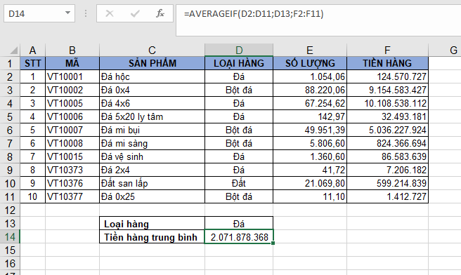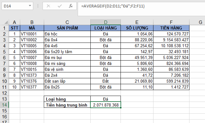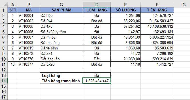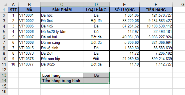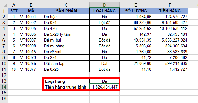 Ví dụ ta có bảng dữ liệu như hình dưới, yêu cầu tính tiền hàng trung bình của các mặt hàng là Đá.