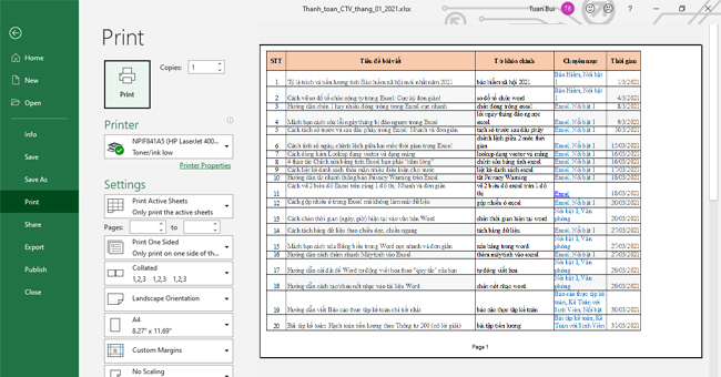 Sau đó bạn ấn OK để in tài liệu. Như vậy việc in trang chẵn lẻ cho tài liệu Excel đã hoàn tất.