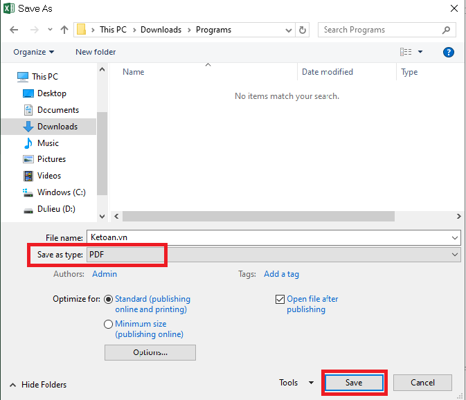 Tại cửa sổ Save As, mục Save as type, bạn chọn kiểu PDF để lưu file Excel dưới dạng file PDF. Chọn Save để hoàn tất.
