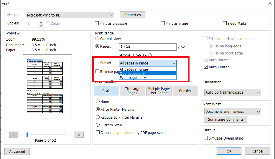 Khi cửa sổ Print mở ra, ngoài các thiết lập in khác, bạn phải thiết lập mục Subset. Đây là phần thiết lập in trang chẵn lẻ mà chúng ta đang cần. Tại mục Subset, lựa chọn mặc định luôn là All page in range (in tất cả các trang). Chúng ta cần đổi nó thành Odd pages only hoặc Even pages only. Trong đó: