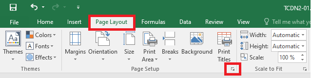 Trên thanh công cụ, chọn Page Layout ra sau đó chọn vào biểu tượng mở rộng của mục Page Setup.