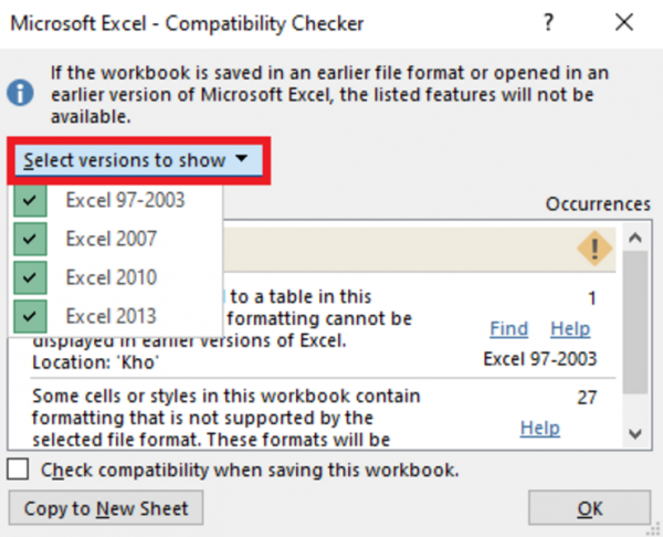 Bước 3: Khi cửa sổ Microsoft Excel – Compatibility Checker xuất hiện, chọn Select version to show để hiển thị danh sách các phiên bản Excel và chọn phiên bản để kiểm tra tính tương thích.