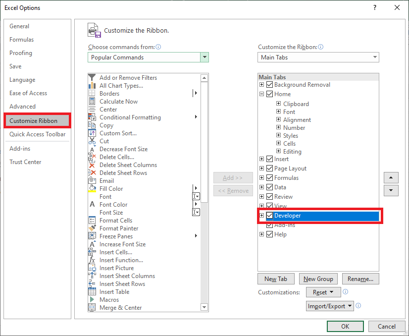 Bước 2: Lúc này, cửa sổ Excel Options hiện ra. Tại danh mục trên trái các bạn chọn thẻ Customize Ribbon. Sau đó tại mục Main Tabs ở bên phải các bạn tìm tới mục Developer rồi tích chọn vào ô vuông đó. Cuối cùng các bạn nhấn OK để hoàn tất cài đặt.
