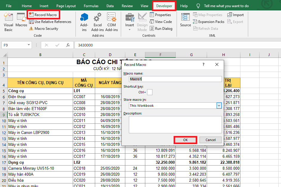 Bước 3: Lúc này, thẻ Developer đã xuất hiện trên thanh công cụ. Các bạn chọn thẻ Developer. Sau đó chọn mục Record Macro. Lúc này hộp thoại Record Macro hiện ra, các bạn đặt tên rồi nhấn OK.