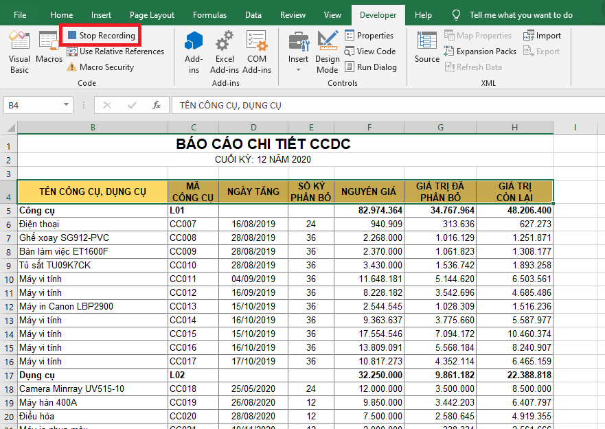 Bước 4: Bây giờ các thao tác của bạn sẽ được Excel bắt đầu ghi lại. Các bạn tiến hành chỉnh sửa dữ liệu theo ý muốn như chỉnh sửa kiểu chữ, size chữ, tô màu nền hay là sắp xếp theo thứ tự… Sau khi chỉnh sửa xong, các bạn nhấn chọn mục Stop Recording để dừng việc tạo Record Macro.