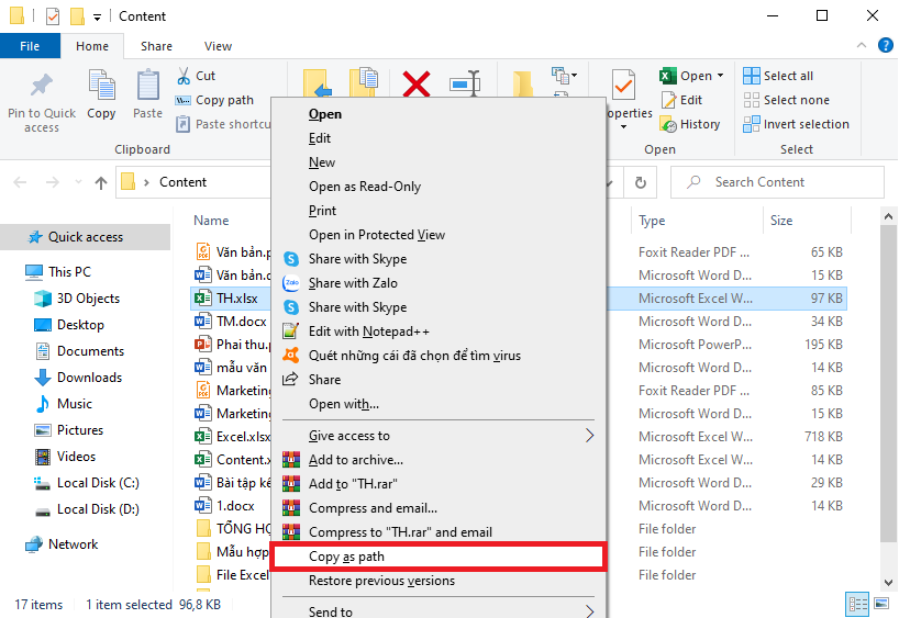 Cách 2: Tìm đến thư mục chứa file excel sau đó giữ phím Shift, nhấn chuột phải và chọn mục Copy as path để copy đường dẫn đầy đủ của file