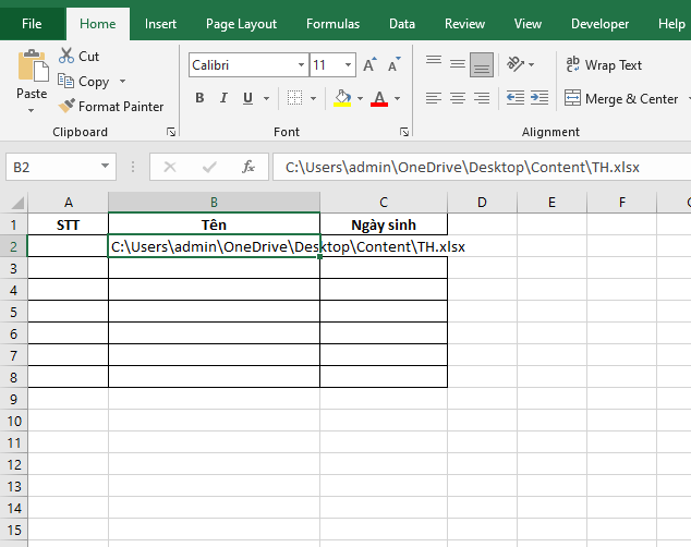 - C:\Users\admin\OneDrive\Desktop\Content\: Đây là đường dẫn tới thư mục chứa file Excel bạn cần lấy dữ liệu
