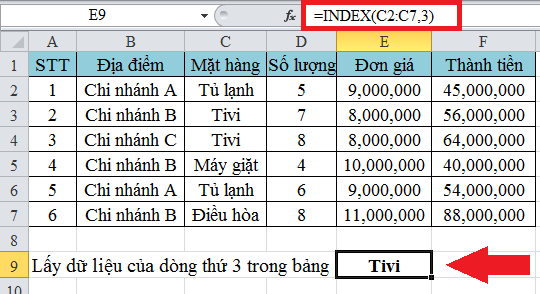 Hàm INDEX dạng mảng giúp lấy giá trị từ một ô trong vùng dữ liệu dựa trên số hàng (row_num) và số cột (column_num).