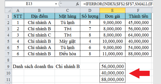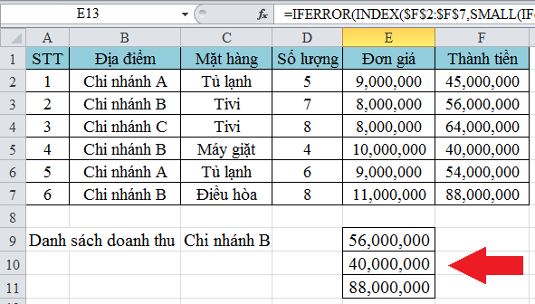 - $B$5:$B$9: Cột chứa thông tin điều kiện (chi nhánh).