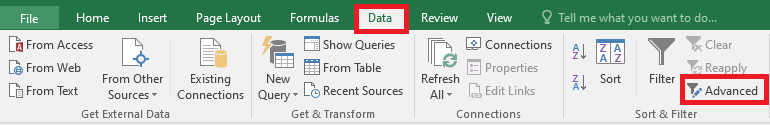- Bước 2: Tại sheet cần điền dữ liệu lọc tiến hành mở Advanced Filter với thao tác Data > Advanced.