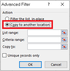 - Bước 3: Cấu hình Advanced Filter => Chọn Copy to another location => Thiết lập List range, Criteria range và Copy to => Sau đó nhấn OK.
