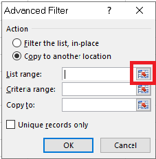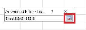 Tại mục List range (vùng dữ liệu cần lọc) bạn chọn vào biểu tượng khoanh đỏ như hình dưới để chọn vùng dữ liệu cần lọc. Vùng dữ liệu này chính là dữ liệu trong Sheet1.