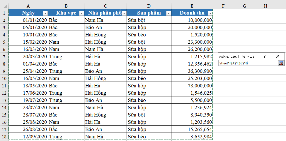 Sau đó kéo chuột để chọn vùng dữ liệu cần lọc tại Sheet1.