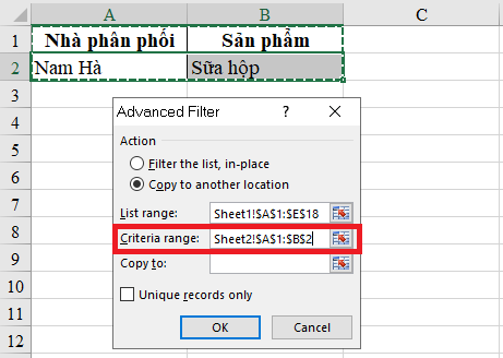 Tại mục Criteria range (vùng điều kiện lọc), kéo chọn vùng điều kiện trong Sheet2 (A1:B2).