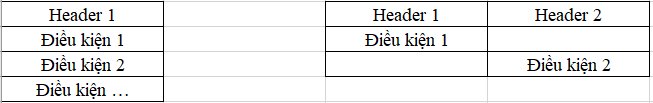 + Mối quan hệ bổ sung (điều kiện dạng hoặc): chỉ cần 1 trong những điều kiện được thỏa mãn. Mỗi điều kiện sẽ kèm theo 1 tiêu đề, nếu trong cùng 1 cột tiêu đề thì đặt ở dòng phía dưới trên cùng cột tiêu đề đó. Các điều kiện không nằm trên cùng 1 hàng mà đặt so le nhau.