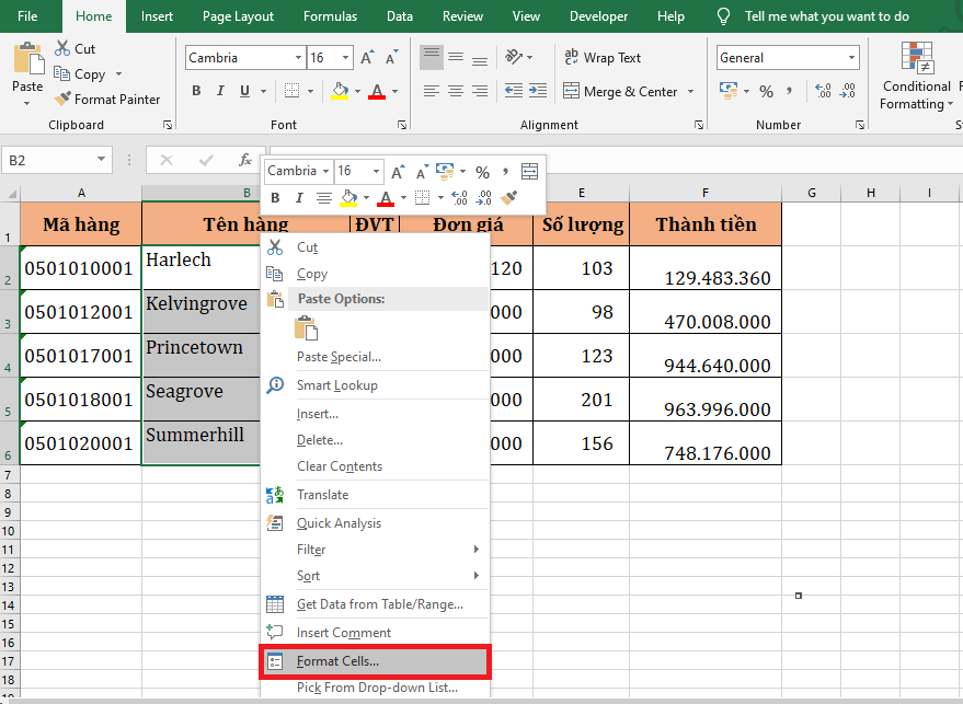 Bôi đen ô/vùng dữ liệu muốn chỉnh > chuột phải > chọn Format Cells (hoặc ấn phím tắt Ctrl + 1 để mở nhanh hộp thoại Format Cells)