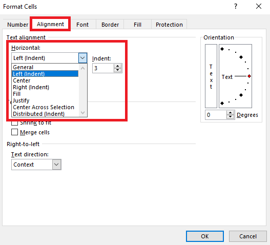 Lúc này, hộp thoại Format Cells hiện ra. Các bạn chọn thẻ Alignment. Tại mục Horizontal sẽ có các vị trí căn lề cho dữ liệu trong ô cho các bạn lựa chọn như sau: