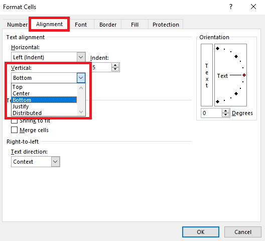 Ví dụ trong trường hợp này mình căn lề dưới thì mình sẽ chọn Bottom ở mục Vertical. Kết quả ta sẽ thu được là dữ liệu đã được căn dưới một cách nhanh chóng.