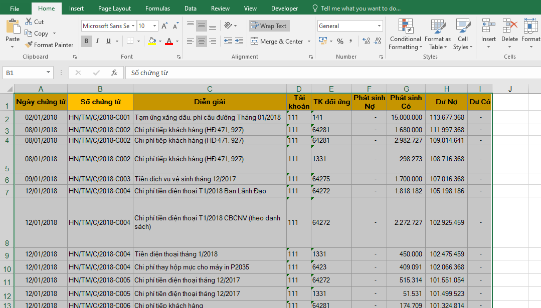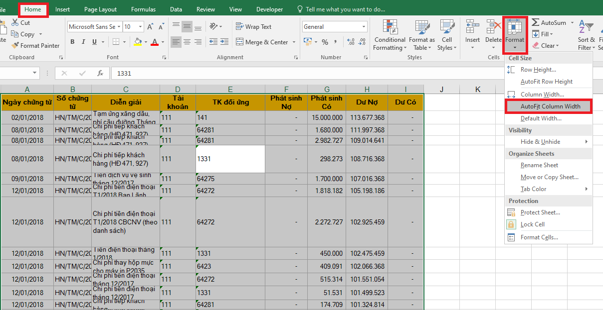 Để điều chỉnh độ rộng của cột, độ cao của hàng trong Excel phù hợp với độ dài dữ liệu trong ô một cách đẹp mắt, ta có thể thực hiện như sau:
