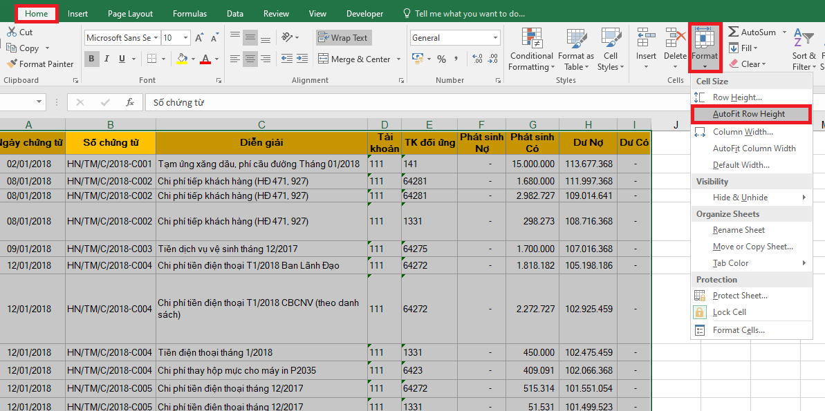 Để tự động chỉnh chiều cao của hàng trong Excel đều nhau tự động ta sử dụng AutoFit như sau: