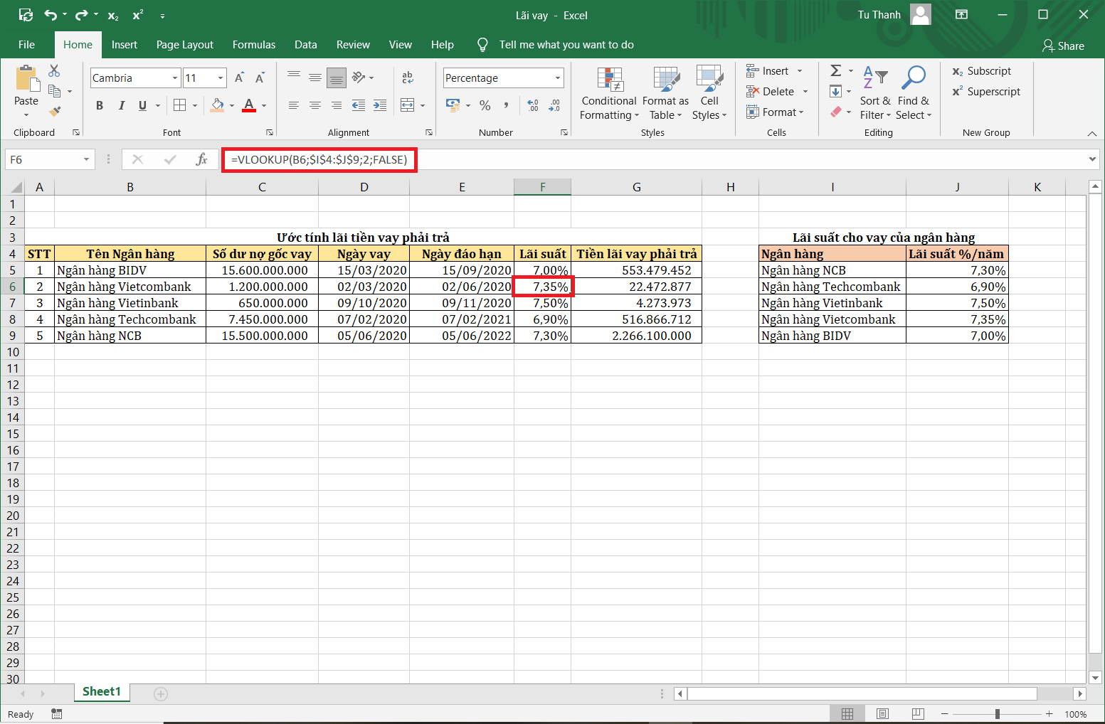 Lúc này, công thức hiển thị cho ô F6=VLOOKUP(B6;$I$4:$J$9;2;FALSE). Qua thao tác sao chép công thức từ ô F5 xuống ô F6, chúng ta có thể thấy tương quan thay đổi vị trí. Khi tiến hành sao chép công thức, chỉ có địa chỉ tương đối thay đổi, vị trí tuyệt đối cố định.