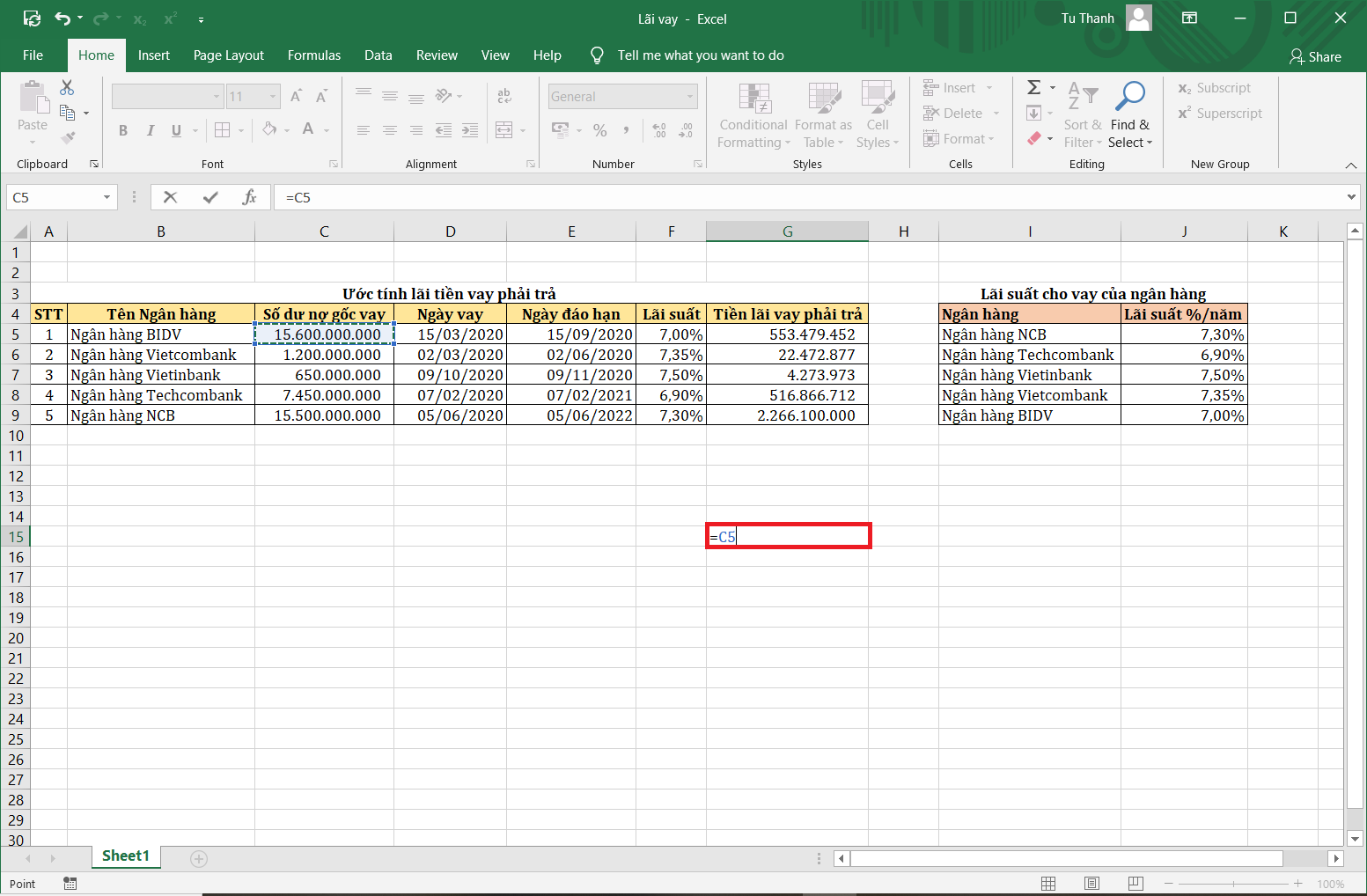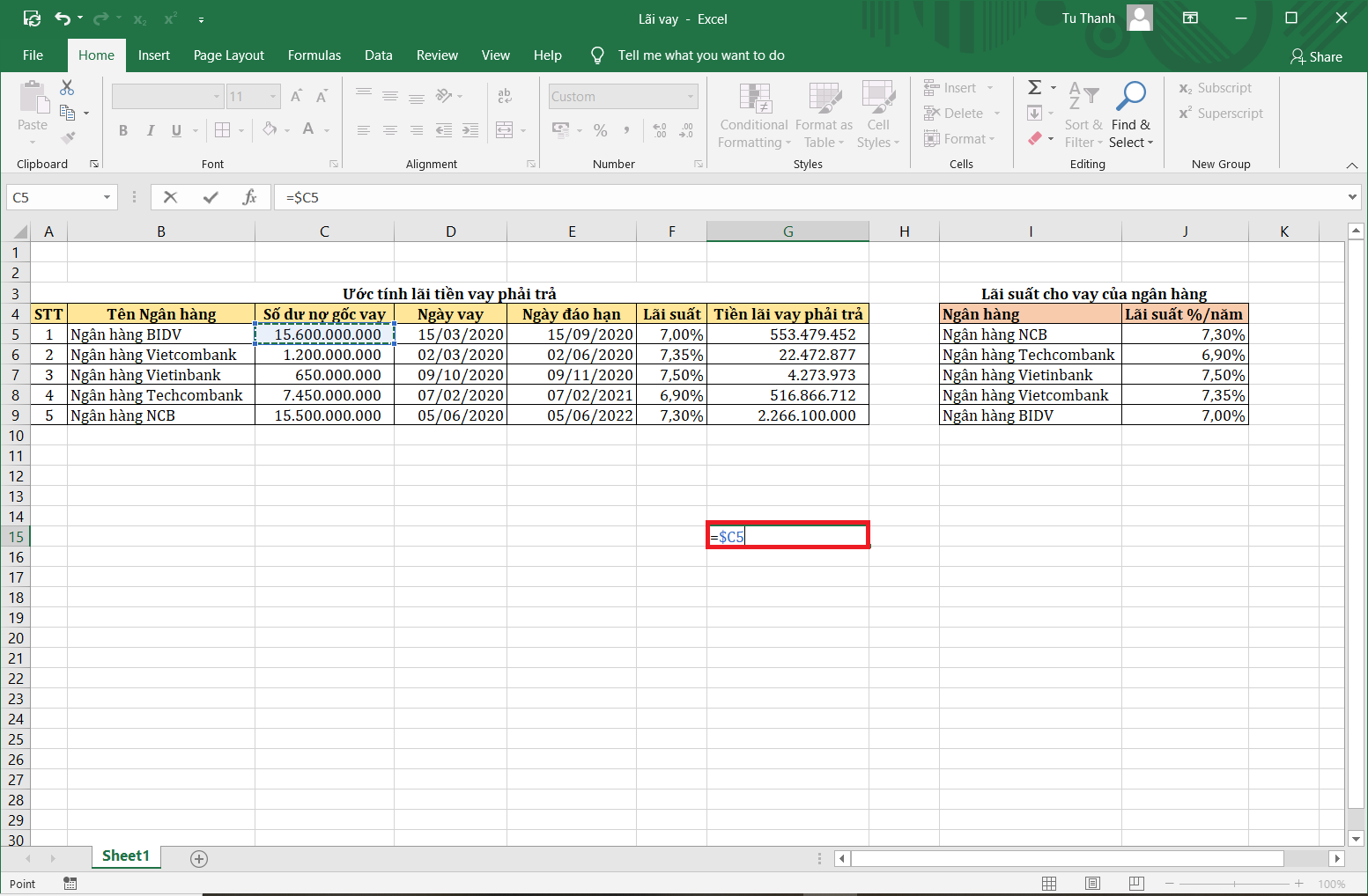 Tương tự như trên, nếu các bạn nhấn F4 liên tục 3 lần. Excel sẽ trả về công thức của ô G15=$C5. Excel đang hiểu rằng, các bạn đang muốn cố định cột và thay đổi dòng, tuyệt đối cổ và tương đối dòng.