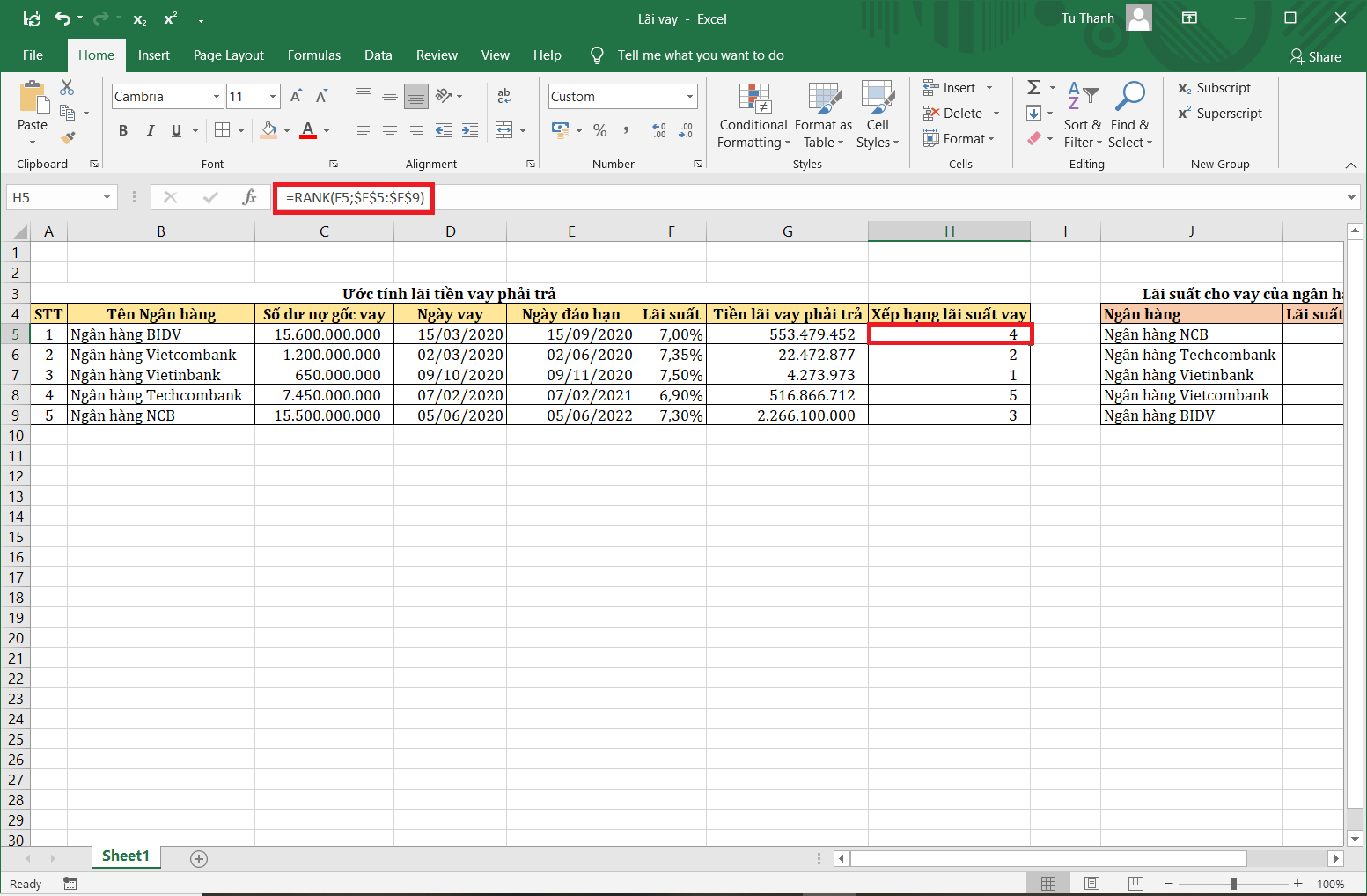 Ví dụ dưới đây sử dụng hàm RANK để tìm ra mức lãi suất từ cao xuống thấp của các ngân hàng như sau. Tại ô H5=RANK(F5;$F$5:$F$9). Tương tự, sao chép công thức xuống các ô bên dưới, các bạn sẽ nhận được kết quả trả về là thứ hạng mức lãi suất của các ngân hàng.