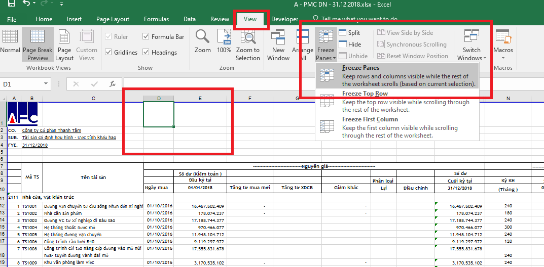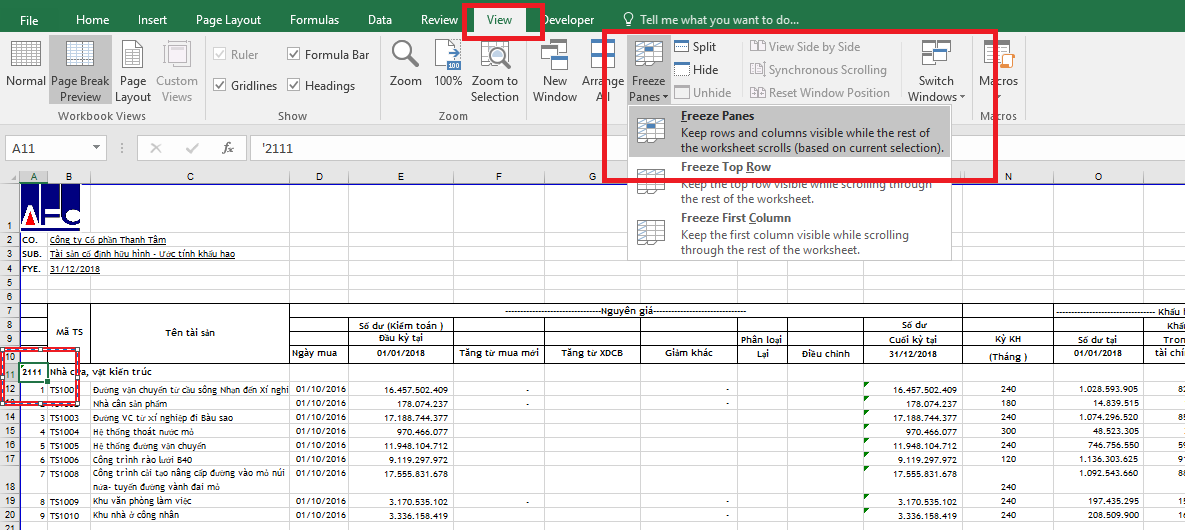 Sau đó bạn chọn thẻ View => Freeze Panes => Freeze Panes.