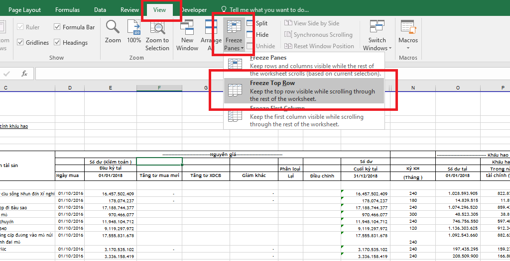 Nếu bạn cần cố định 1 dòng đầu tiên của trang tính. Chọn thẻ View => Freeze Panes => Freeze Top Row.