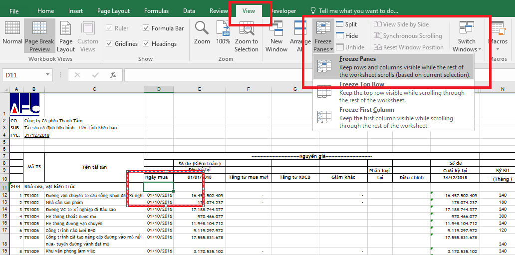 Ví dụ: Muốn cố định 10 dòng đầu và 3 cột đầu thì ta đặt con trỏ chuột tại ô thứ 4 của dòng 11 (ô thứ 11 của cột 4) tức là ô D11 như hình dưới.