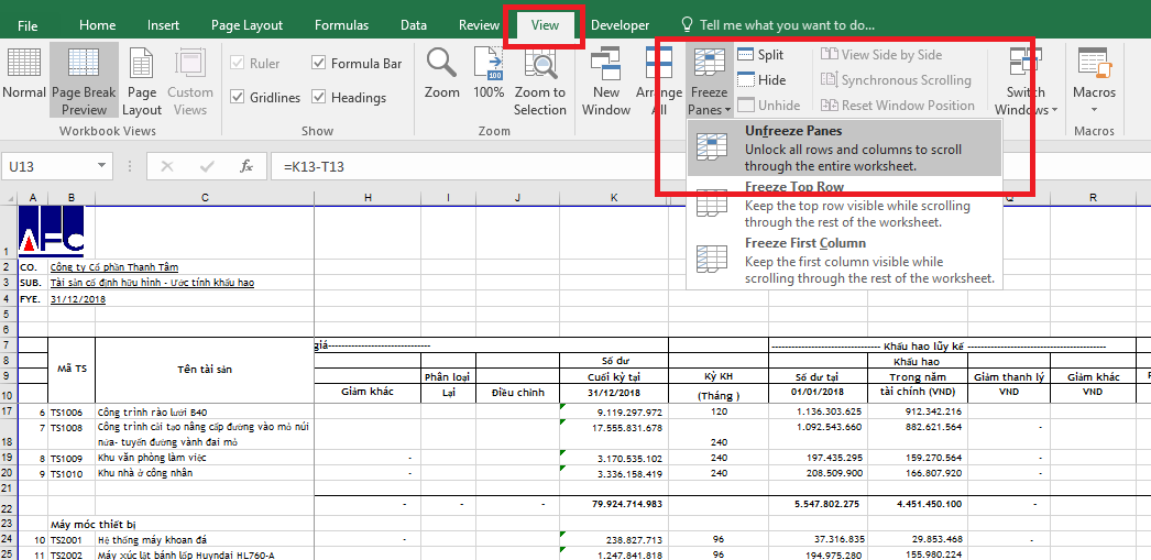 Nếu không muốn cố định hàng và cột nữa thì chỉ cần chọn thẻ View => Freeze Panes => Unfreeze Panes.