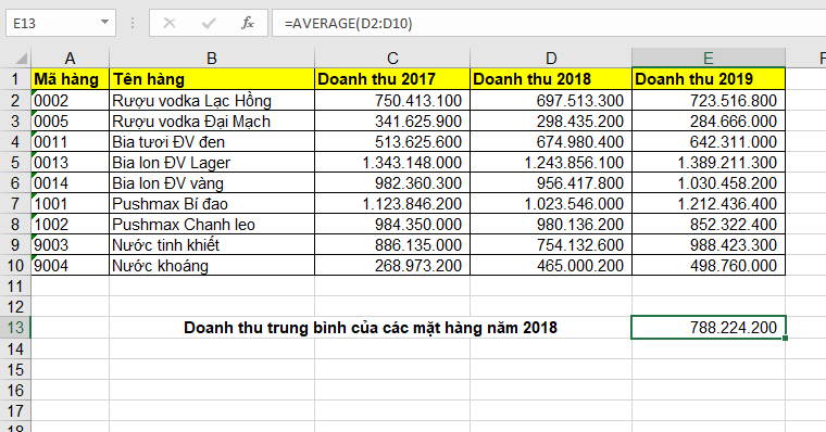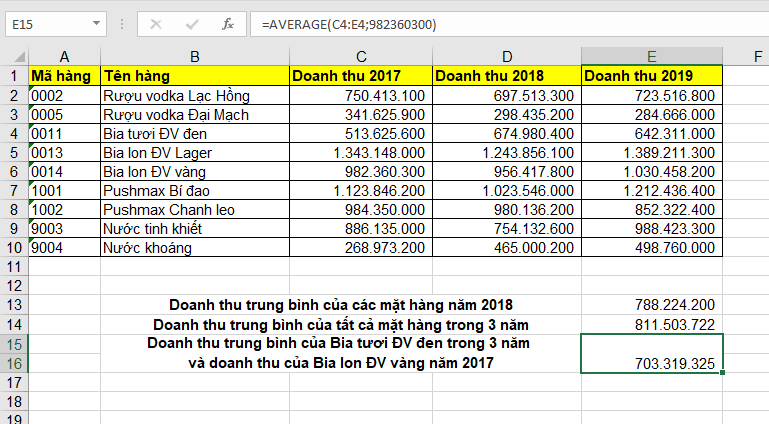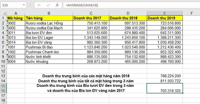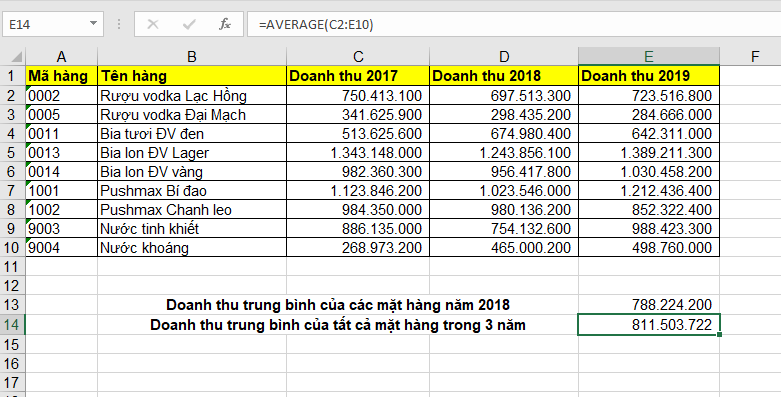 Ta được kết quả doanh thu trung bình tất cả mặt hàng trong 3 năm như sau:
