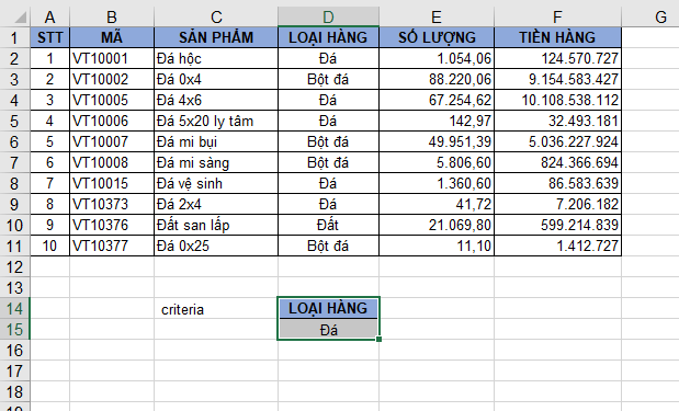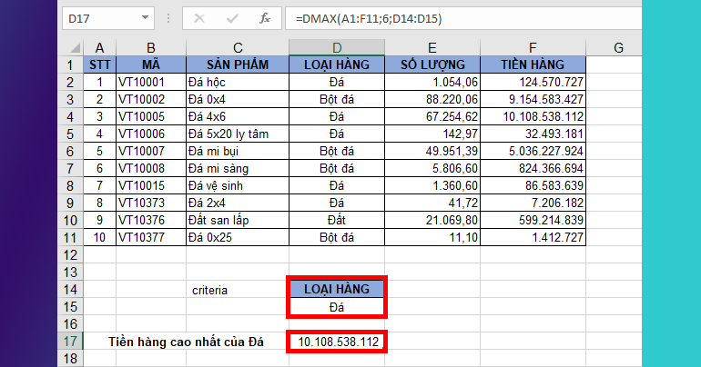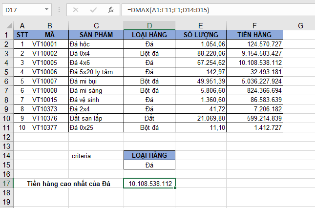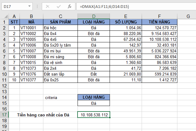 A1:F11là bảng dữ liệuF1là cộtTIỀN HÀNG, cột cần tìm giá trị cao nhất.D14:D15là vùng điều kiệncriteria.