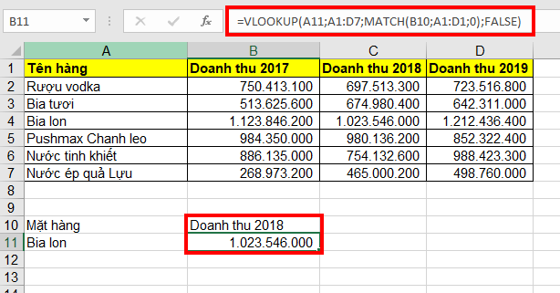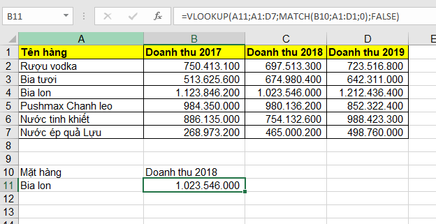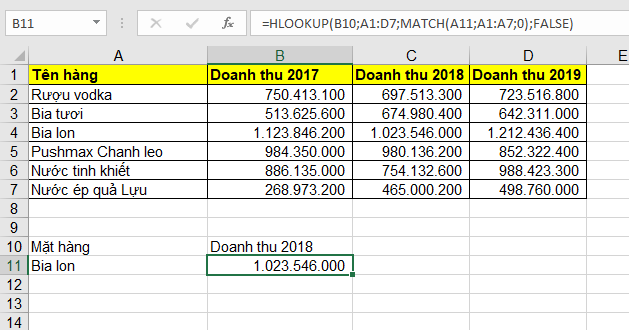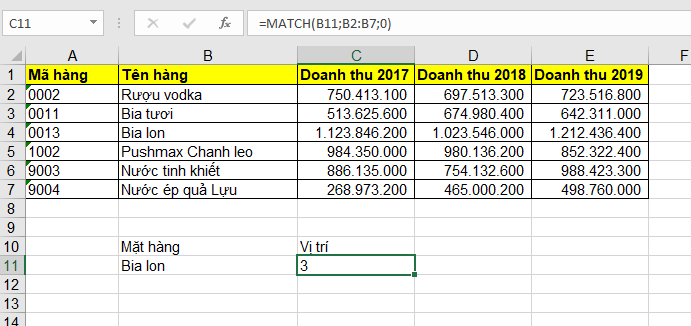 Ví dụ: Tên hàng ở cột B và Doanh thu các năm ở các cột C, D, E. Để tìm ra vị trí của loại hàng (ví dụ Bia lon), sử dụng công thức sau: =MATCH(B11;B2:B7;0)