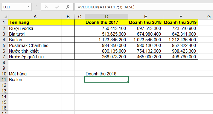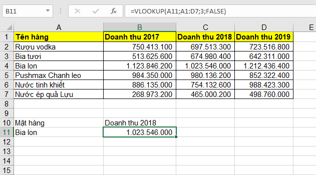 Tham số col_index_num được đặt là 3 vì Doanh thu 2018 mà chúng ta muốn kéo nằm ở cột thứ 3 trong bảng.