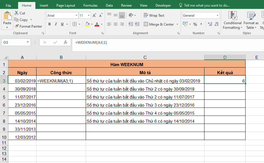 - Số thứ tự của tuần bắt đầu vào Thứ 3 có ngày 23/12/2016: =WEEKNUM(A6;12)