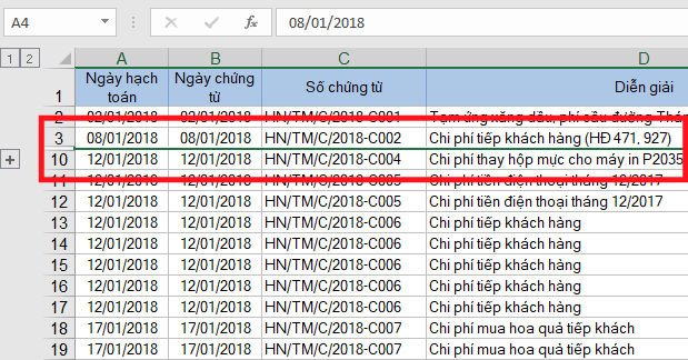 Đầu tiên ta tạo cấp 1 như bình thường. Sau đó bôi đen những hàng cần tạo group cấp nhỏ hơn rồi vẫn thực hiện như bình thường. Lúc này các mức độ Group nhỏ hơn sẽ được tạo.