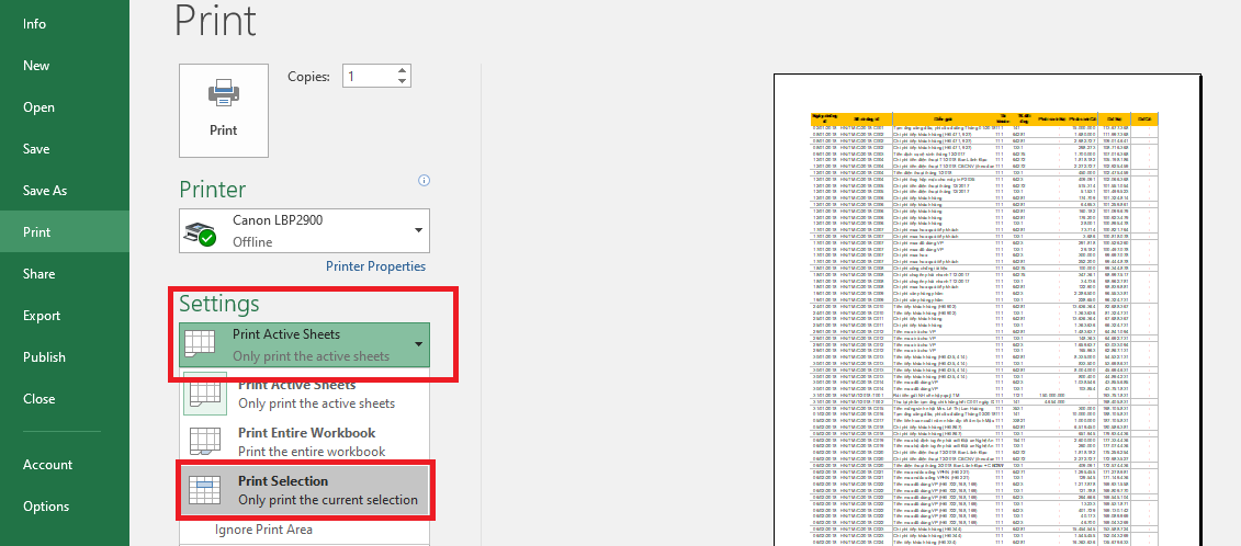 - B3: Tại cửa sổ Prints: ở mục Settings bấm vào menu xổ xuống và chọn Print Selection. => phần Preview sẽ hiển thị vùng dữ liệu đã chọn ở bước 1.