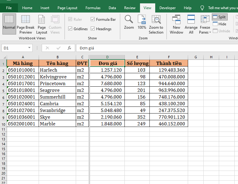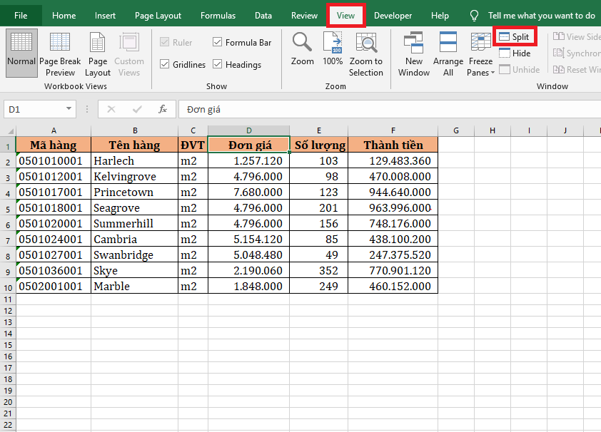 Để chia sheet thành 2 phần theo chiều dọc, ta cần đặt con trỏ chuột tới đầu cột ở vị trí cần tách (ví dụ muốn tách bảng thành 2 phần từ cột D thì ta sẽ đặt chuột ở ô D1) => sau đó ta vào thẻ View => rồi chọn Split.