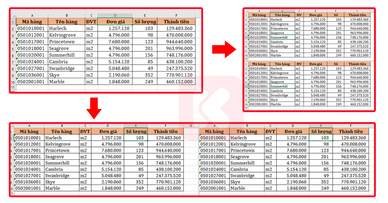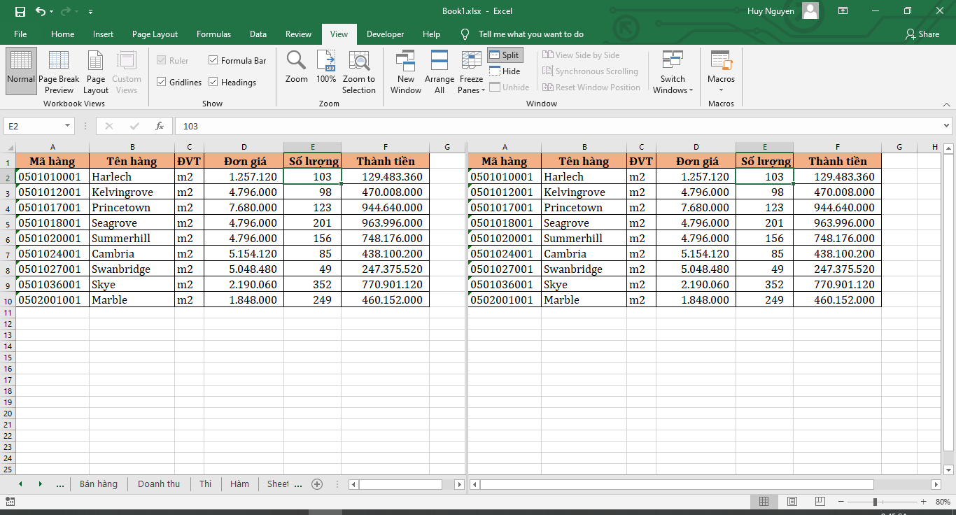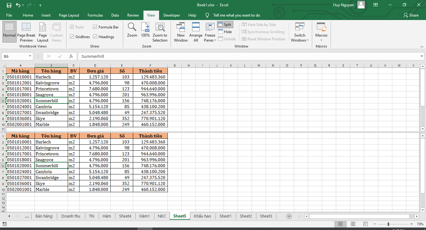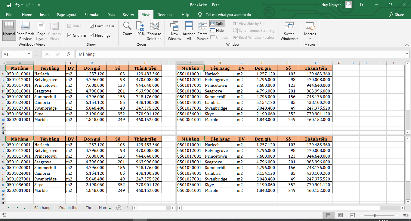 Ta có thể thao tác, cuộn để đối chiếu so sánh dữ liệu trên cả 4 phần trang tính. Khi chỉnh sửa dữ liệu trên 1 trang tính thì các trang còn lại cũng sẽ thay đổi theo: