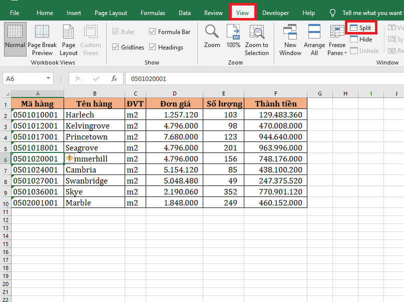 Để chia bảng tính theo chiều ngang, ta sẽ vẫn sẽ sử dụng SPLIT nhưng vị trí đặt con trỏ chuột sẽ nằm đầu hàng ở vị trí cần chia trang. Ví dụ muốn chia bảng thành 2 phần từ hàng số 6 thì ta sẽ đặt chuột ở vị trí A6 => sau đó chọn View => rồi chọn Split.