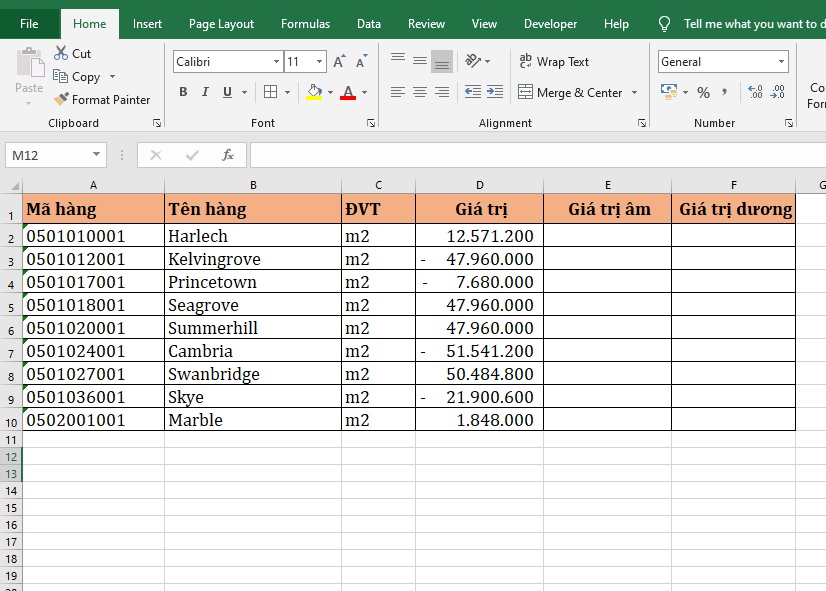 Ví dụ ta có bảng dữ liệu như hình dưới. Yêu cầu cần tách riêng giá trị âm và giá trị dương. Để thực hiện, các bạn hãy làm theo các bước sau.